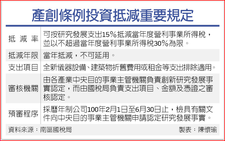 產業升級條例已在98年度正式落日,企業的投資抵減申請法源變成了產創條例,南區國稅局指出,產創條例相關規定因經過充分討論,比如可按研究發展支出15%抵減當年度營所稅,並以不超過當年度營所稅30%為限,而且只能當年抵減,不可延用,以及全新儀器設備、建築物折舊費用或租金等支出排除適用等重大改變,企業大都已經明瞭,但對該怎麼申請抵減,則是現階段最關心要點。